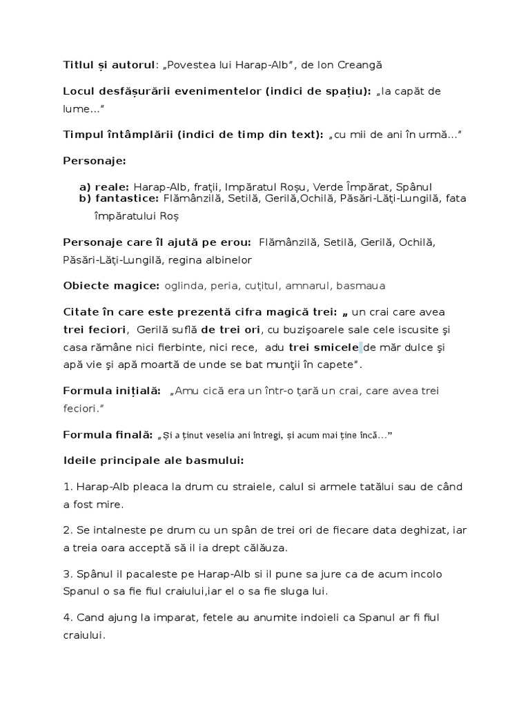 vizitati articolul complet aici : https://www.youtube.com/watch?v=fqQFaGJz-No Conflictul dintre bine si rau se incheie prin victoria fortelor binelui. De sluga si de print al luminii. Harap alb este personajul principal si eponim al basmului, intruchipare a binelui, dar este un erou atipic de basm, deoarece.
