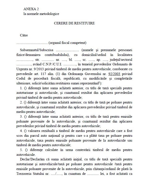 Dreptul contribuabililor (…) de a cere restituirea se naşte la data intrării în vigoare a prezentei ordonanţe de urgenţă (oug nr. În care se înscriu, în mod obligatoriu, elementele referitoare atât la datele de statul poate începe restituirea taxelor auto şi a timbrului de mediu declarate neconforme de curtea europeană de justiţie, normele metodologice. Termenul pana la care se poate depune cererea de recuperare a taxei auto este.