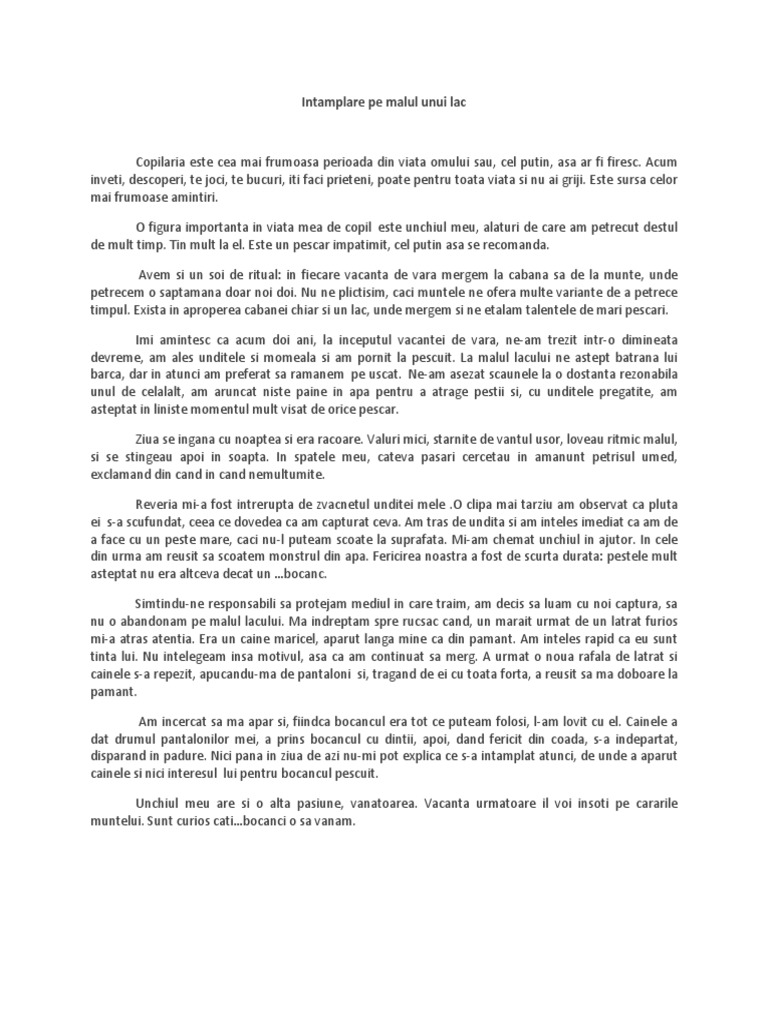 vizitati articolul complet aici : http://mconline.ro/2011/05/o-intamplare-in-vacanta-de-vara/ Centenarul marii uniri ‒ compunere despre povestea marii uniri. Marian godină a fost martorul unui episod neplăcut când se afla pe plajă. În timp ce părinții ocupau un loc pe plajă, împreună cu sora mea am intrat in mare.