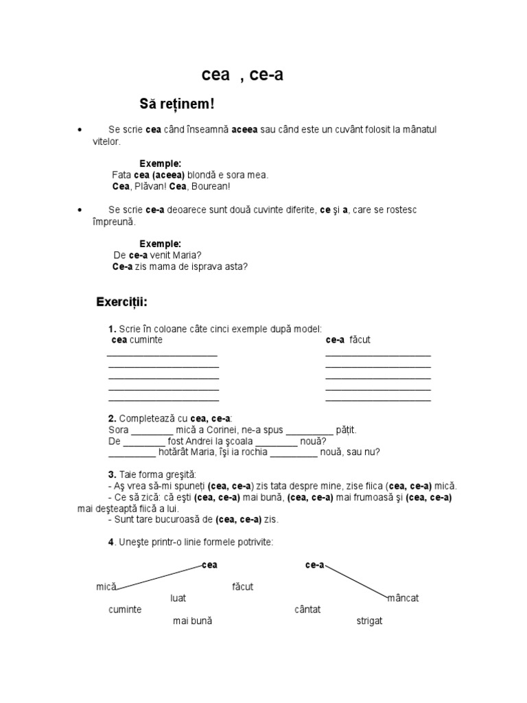 Cea se scrie cea când se referă la o ea, un substantiv feminin singular, şi e însoţit de un adjectiv: Acum, oamenii de ştiinţă oferă un răspuns la această ghicitoare. Fo] 1 i strigăt cu care se mână boii spre dreapta.