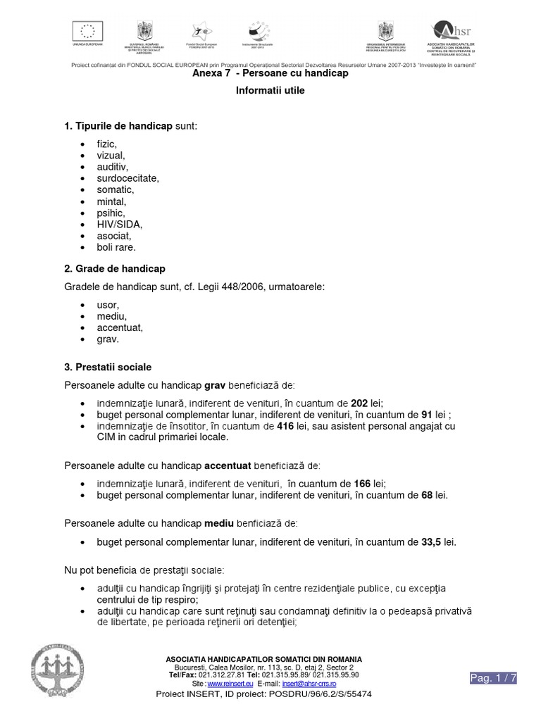 Adultii cu handicap beneficiaza de urmatoarele prestatii sociale: Persoanele cu handicap grav care au şi calitatea de pensionari de invaliditate gradul i pot opta pentru indemnizaţia pentru însoţitor prevăzută la art. Intra in contact cu expertii.